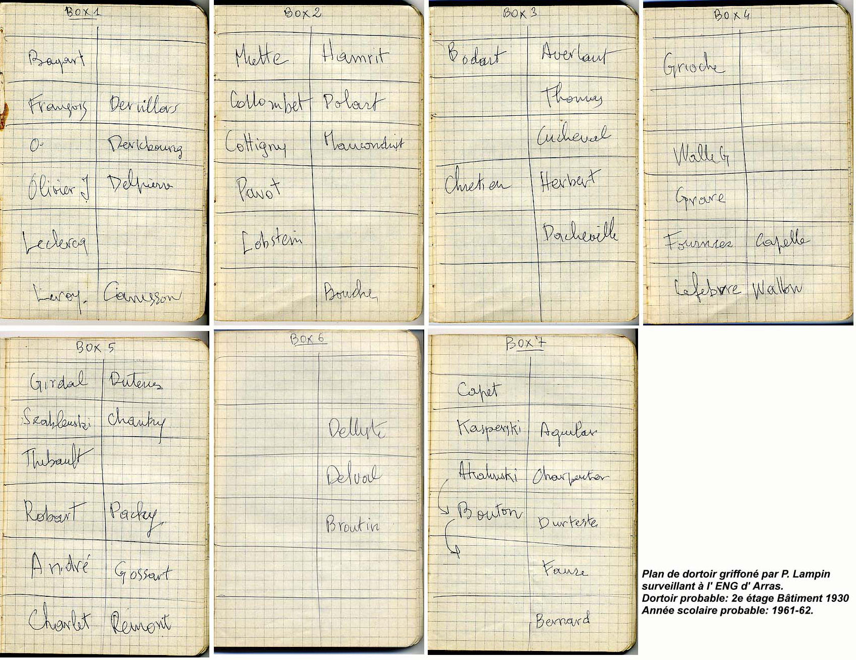 Pierre LAMPIN (54 - 58): Ce document est une sorte de plan de dortoir que j' ai pris sur un carnet. J' ignore exactement quand et pourquoi. C' est votre promo. Il ne peut pas y avoir tant d' homonymes. Pourquoi y a-t-il des lits sans nom? C' est vous qui pouvez peut-être répondre. |
