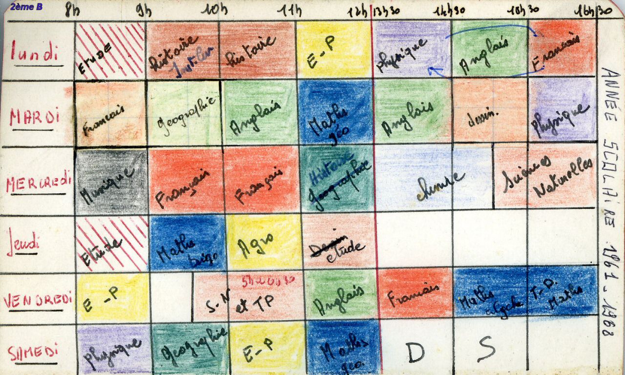 Ensuite, je vous propose de vous replonger dans une semaine type en vous rappelant l'emploi de notre temps en 2ème B, qui devait peu ou prou identique dans les autres classes de 2ème année.