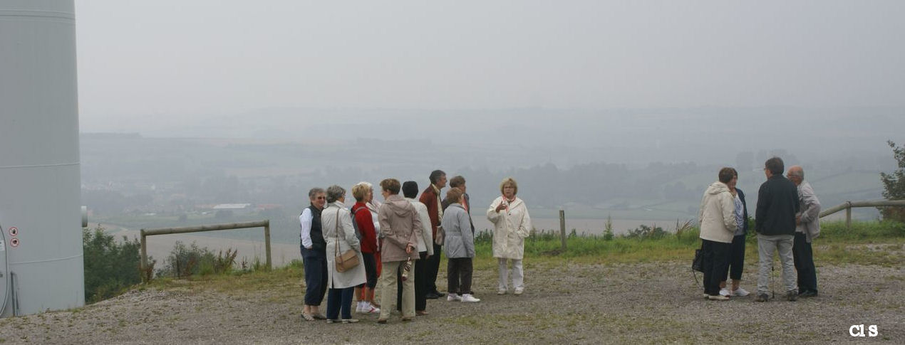 10H15: Découverte de la table d’orientation sur le chemin des éoliennes et petite promenade apéritive au pied des éoliennes. Hélas, une brume tenace n'a pas permis d'apprécier comme il se doit le magnifique paysage du Haut Pays d'Artois qui s'offre aux regards à cet endroit.