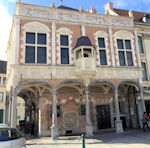 Rue du Bourg, deux cartouches « ANNO » et « 1600 » indiquent la date de construction du bâtiment.Fièrement campés aux 4 angles de l'attique, des lions assis tiennent entre leurs griffes l'écusson de Bourgogne.