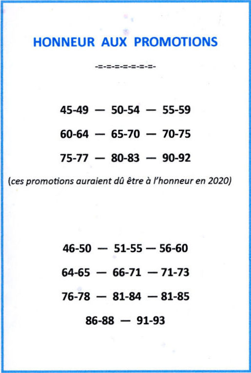 Nous n'avons pas pu nous retrouver le 17mai 2020, ni en mai 2021, avec les autres promotions mises à l'honneur. Nos retrouvailles pour les "balades de septembre", prévues en septembre 2020 n'ont pas pu se faire non plus. Sans parler des rencontres ou réunions en comité plus restreint... Un désastre social vous dis-je !