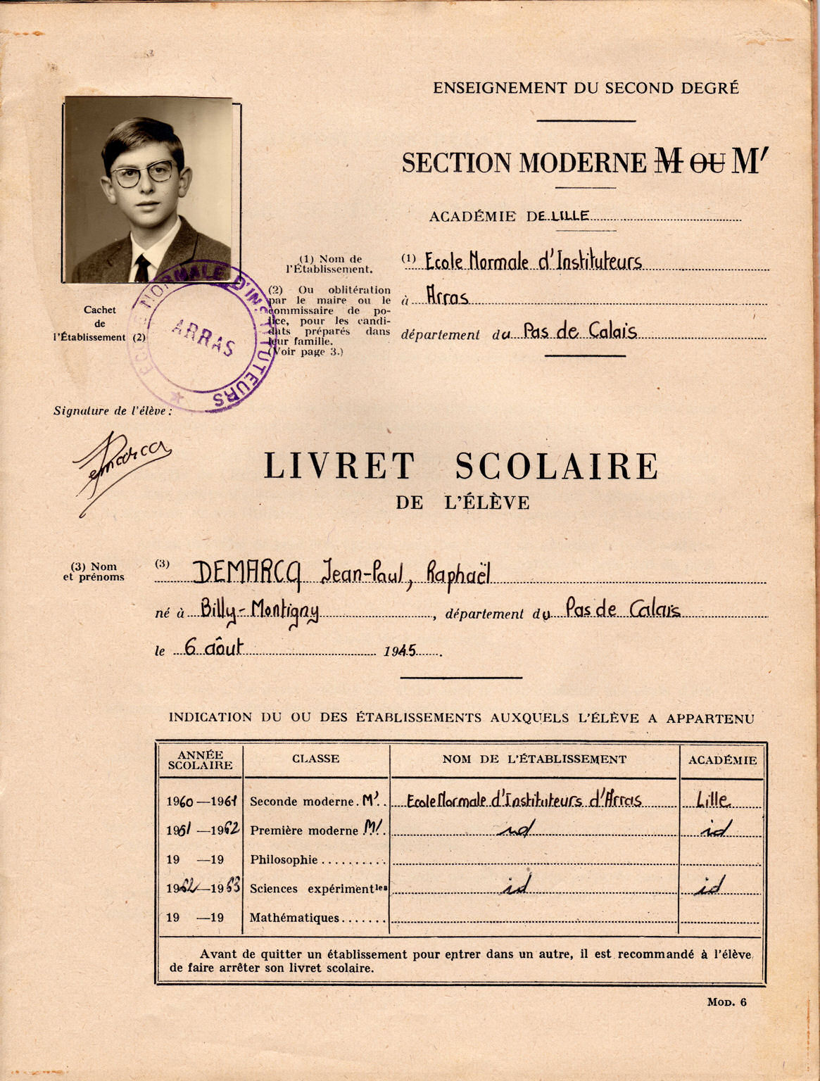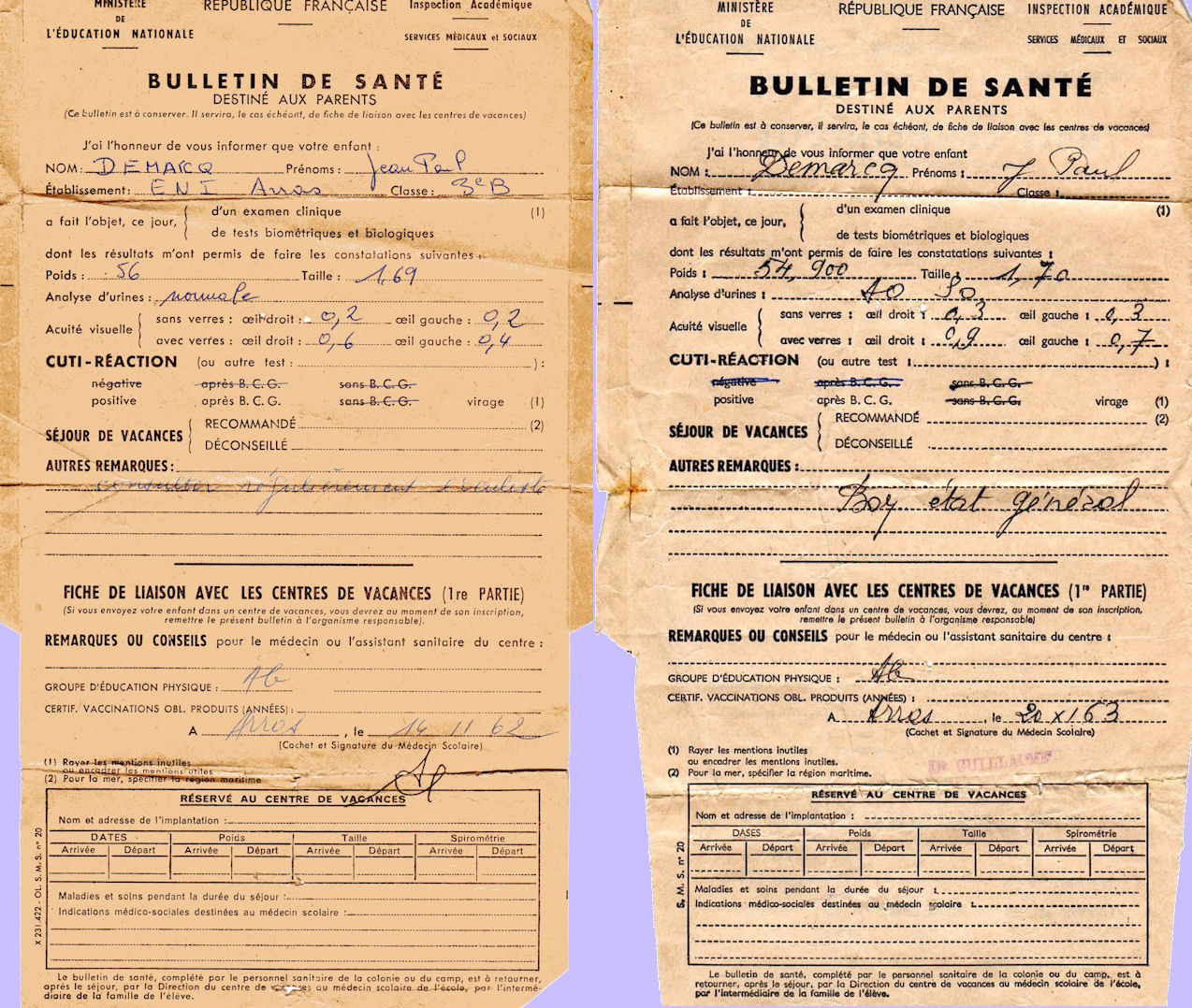 H CHARPENTIER 230 Ko 1961_1962_2c_03.txt JP DEMARCQ 243 Ko Année scolaire 1962-1963 1962_1963_3b_02.txt M FASQUEL 149 Ko 1962_1963_3b_03.txt M FASQUEL 227 Ko Bulletins de santé de JP DEMARCQ du 14.11.1962 et du 20.01.1963. JP DEMARCQ, le 19.10.2010 (par mail):