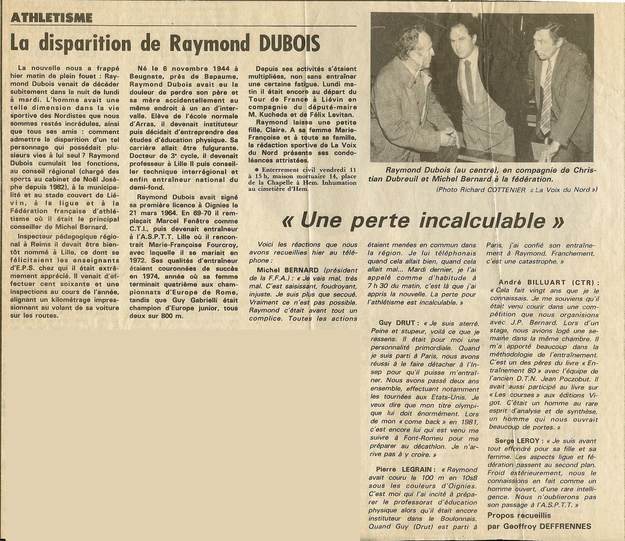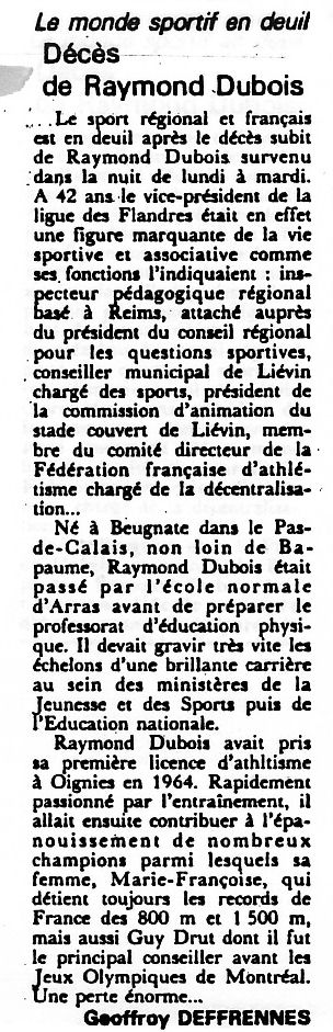 Alors que j'étais ce matin aux obsèques de Monsieur BOULEUX, Secrétaire Général de la Ligue Nord-Pas-de-Calais d'Athlétisme depuis 44 ans, j'ai eu un flash au passage, à l'offrande, d'anciens athlètes et/ou dirigeants... J'ai oublié Raymond DUBOIS dans la liste des normalots que j'avais convaincus de venir à l'athlé (Raymond ne faisait à l'époque que du foot) et plus particulièrement de signer une licence à l'Etoile d'Oignies... Raymond fut d'abord athlète (de bonnes performances sur 100 mètres mais surtout sur 60 mètres In door), puis très vite entraîneur... Il s'occupa entre autres de Marie-Françoise FOURCROY (sélectionnée aux Jeux Olympiques) qui devint son épouse, mais aussi ponctuellement d'un autre stelliste (Etoile d'Oignies), Guy DRUT (Dispense de présentation) lorsqu'il devint stadiste (Stade Français Paris)... Avant de devenir IPR EPS, Raymond fut, du temps de la présidence fédérale de Michel BERNARD, Directeur Technique National Adjoint... Erreur réparée !Jean-Louis TAVERNIER (le 28.02.2010, par mail):