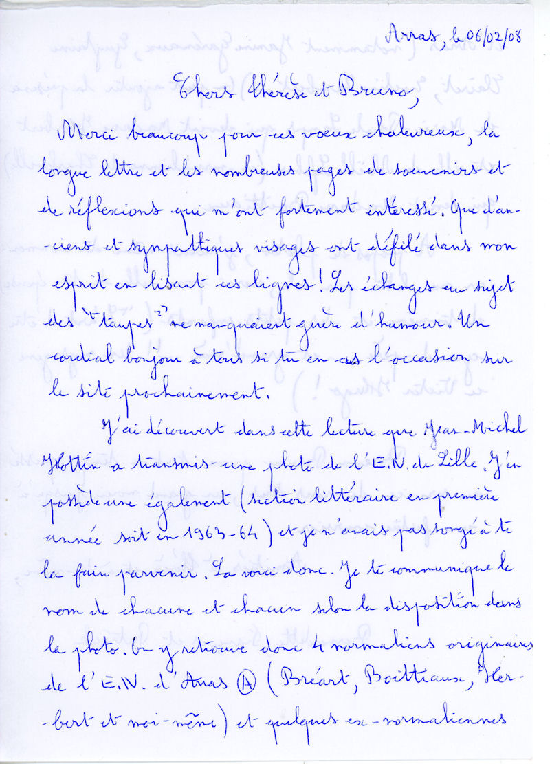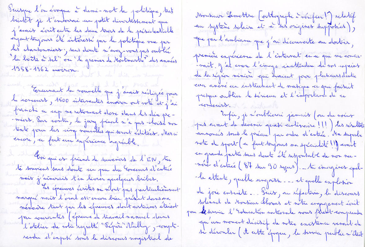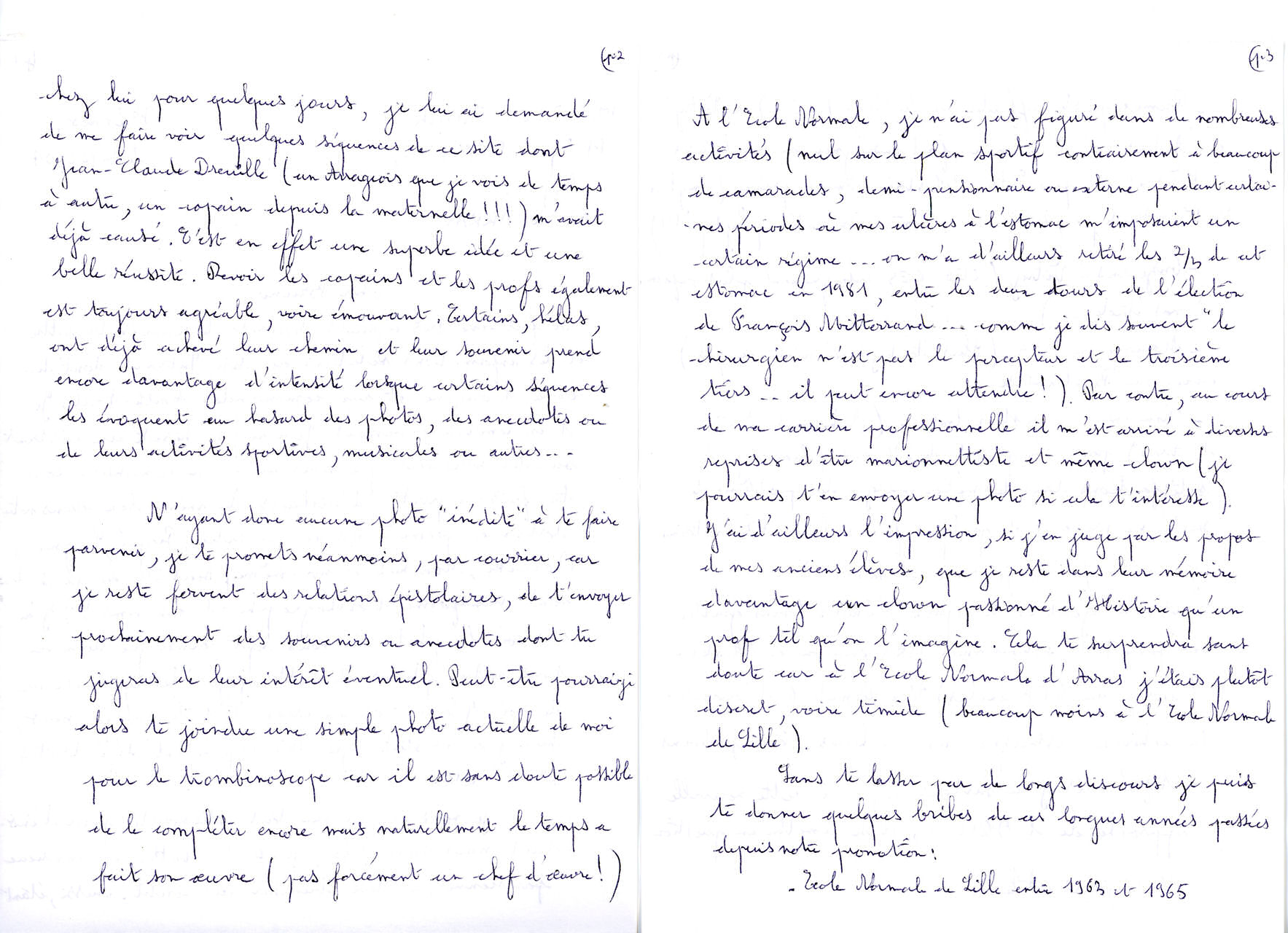 Au cours de ma carrière professionnelle, il m'est arrivé à diverses reprises d'être marionnettiste et même clown (Je pourrais t'en envoyer une photo si cela t'intéresse). J'ai d'ailleurs l'impression, si j'en juge par les propos de mes anciens élèves, que je reste dans leur mémoire davantage un clown passionné d'Histoire qu'un prof tel qu'on l'imagine. Cela te surprendra sans doute, car à l'École Normale d'Arras, j'étais plutôt discret, voire timide (Beaucoup moins à l'École Normale de Lille)"