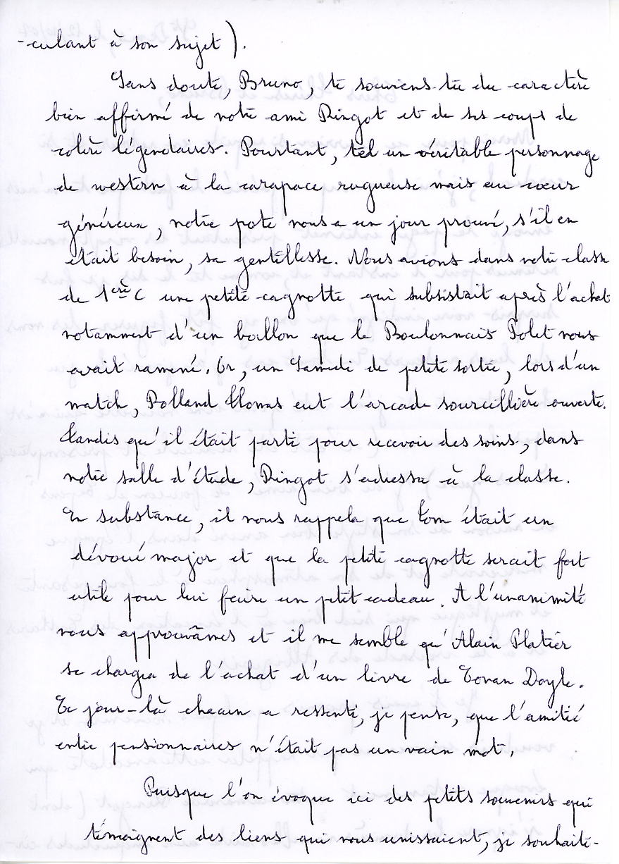 Sans doute, Bruno, te souviens-tu du caractère bien affirmé de notre ami RINGOT et de ses coups de colère légendaires. Pourtant, tel un véritable personnage de western à la carapace rugueuse mais au cœur généreux, notre pote nous a un jour prouvé, s’il en était besoin, sa gentillesse. Nous avions dans notre classe de 1ère C une petite cagnotte qui subsistait après l’achat notamment d’un ballon que le boulonnais POLET nous avait ramené. Or, un samedi de petite sortie, lors d’un match, Rolland THOMAS eut l’arcade sourcilière ouverte. Tandis qu’il était parti pour recevoir des soins, dans notre salle d’étude, RINGOT s’adressa à la classe. En substance, il nous rappela que Tom était un dévoué major et que la petite cagnotte serait fort bien utile pour lui faire un petit cadeau. A l’unanimité nous approuvâmes et il me semble qu’Alain PLATIER se chargea de l’achat d’un livre de Conan DOYLE. Ce jour là chacun a ressenti, je pense, que l’amitié entre pensionnaires n’était pas un vain mot.