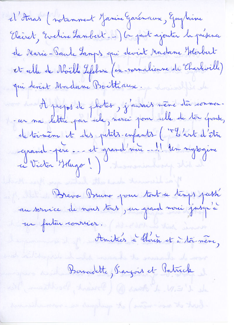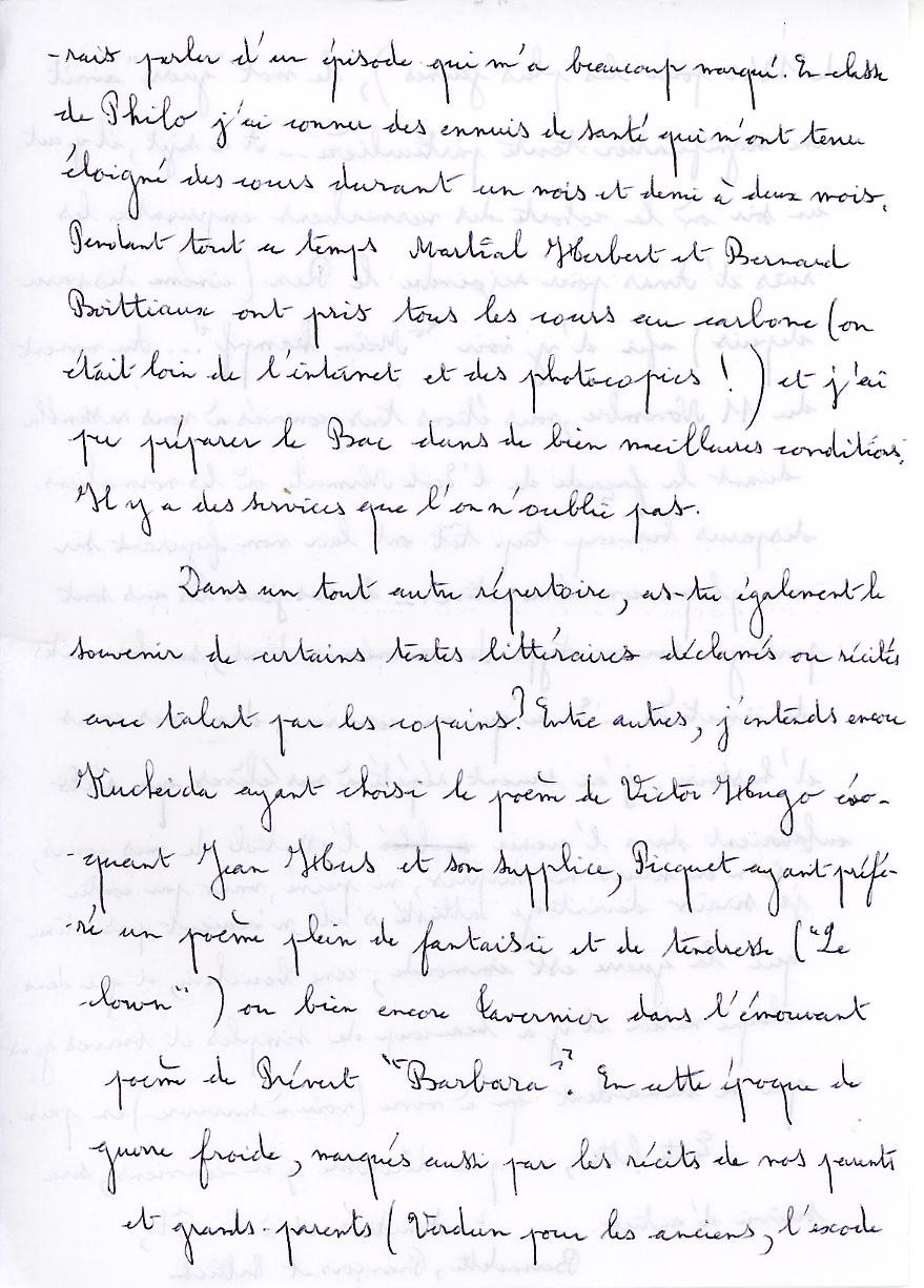 Puisque l’on évoque ici des petits souvenirs qui témoignent des liens qui nous unissaient, je souhaiterais parler d’un épisode qui m’a beaucoup marqué. En classe de philo, j’ai connu des ennuis de santé qui m’ont tenu éloigné des cours durant un mois et demi à deux mois. Pendant tout ce temps, Martial HERBERT et Bernard BOITTIAUX ont pris tous les cours en carbone (on était loin de l’Internet et des photocopies !) et j’ai pu préparer le Bac dans de bien meilleures conditions. Il y a des services que l’on n’oublie pas.