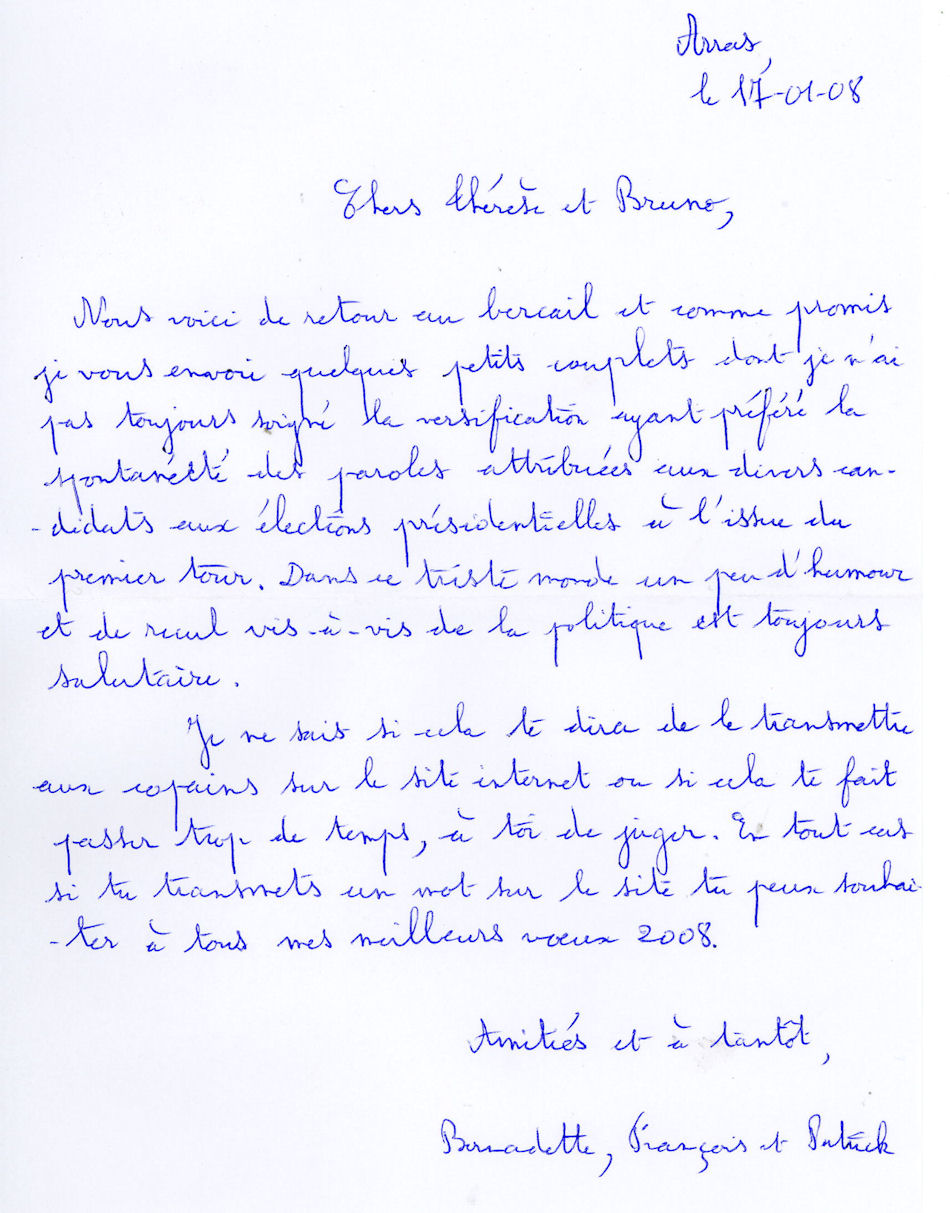 P GOBLET 151 Ko Pages 2 et 3 P GOBLET 337 Ko Pages 4 et 5 P GOBLET 337 Ko Page 6 P GOBLET 92 Ko Lettre de Patrick GOBLET à Bruno PETIT du 1.03.2007 Page 1 P GOBLET 153 Ko Pages 2 et 3 P GOBLET 358 Ko Pages 4 et 5 P GOBLET 252 Ko Lettre de Patrick GOBLET à Bruno PETIT du 12.10.2007 Page 1 P GOBLET 166 Ko Page 2 P GOBLET 182 Ko Page 3 P GOBLET 163 Ko Page 4 P GOBLET 171 Ko Lettre de Patrick GOBLET à Bruno PETIT du 08.01.2008 Page 1 P GOBLET 129 Ko Page 2 et 3 P GOBLET 278 Ko Page 4 P GOBLET 71 Ko Lettre de Patrick GOBLET à Bruno PETIT du 17.01.2008 Page 1 P GOBLET 193 Ko Couplets de Patrick, inspirés par les élections présidentielles 2007 elections_2007.txt P GOBLET 5 Ko Lettre de Patrick GOBLET à Bruno PETIT du 6.02.2008 Page 1 P GOBLET 201 Ko Page 2 P GOBLET 168 Ko Bernadette et Patrick GOBLET en 2012 P GOBLET 168 Ko Pour revenir à la page précédente, fermez cette fenêtre.