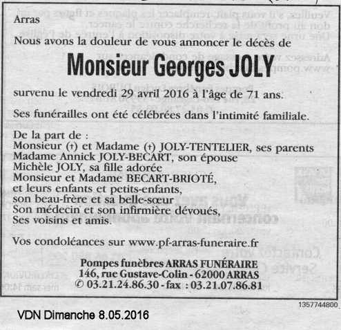 Georges JOLY est originaire de Marquion (62860) ou il est né le 20.02.1945.