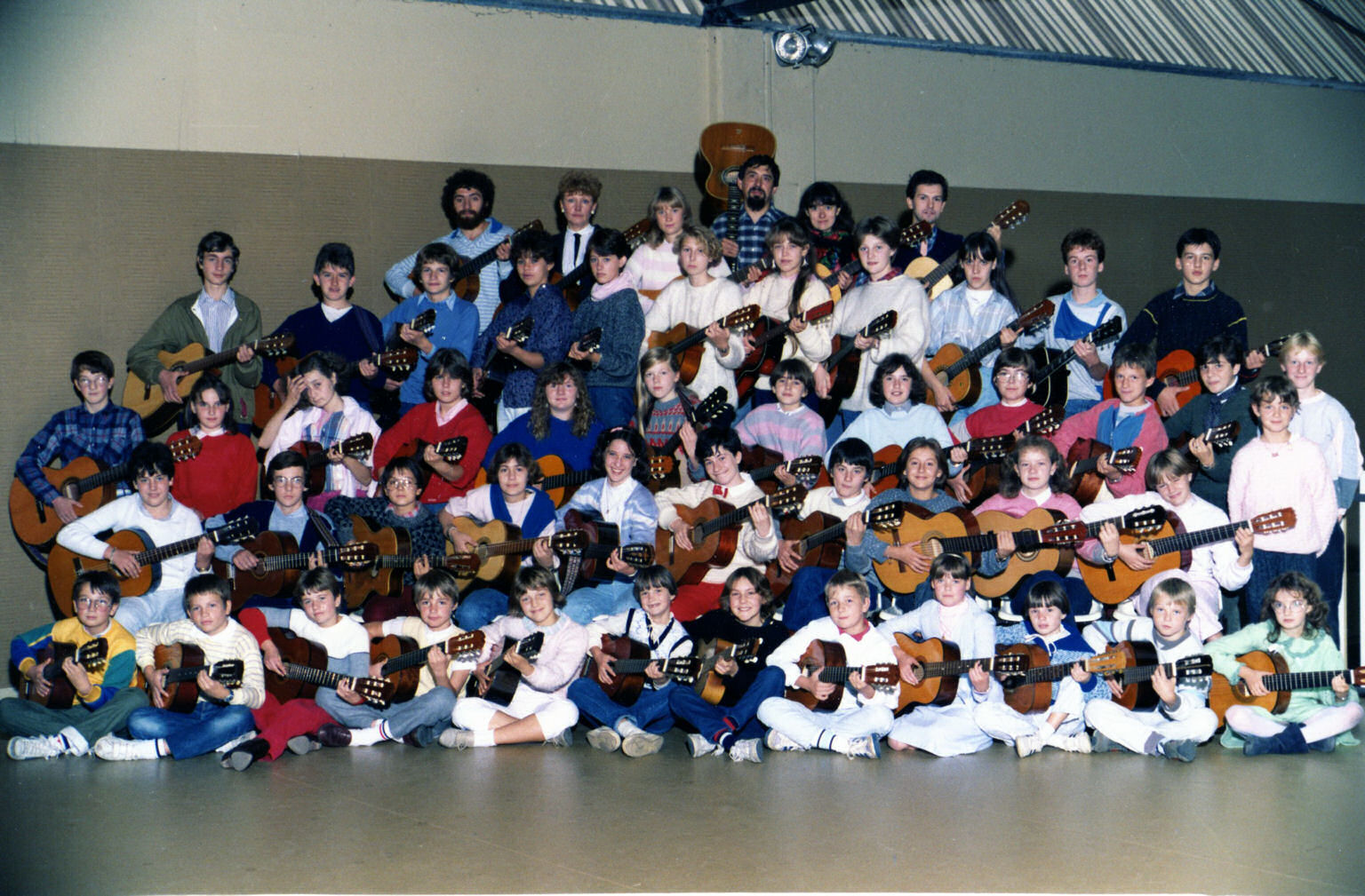 - Après la belle aventure des MIRAGES, j'ai continué la guitare, que j'ai enseignée à plus d'un millier d'enfants et de collègues, dans le cadre d'une chorale scolaire un peu spéciale (cf photo jointe), des stages du PAF et du Conservatoire de Douai. J'ai été aussi longtemps un choriste assidu du Choeur Régional.