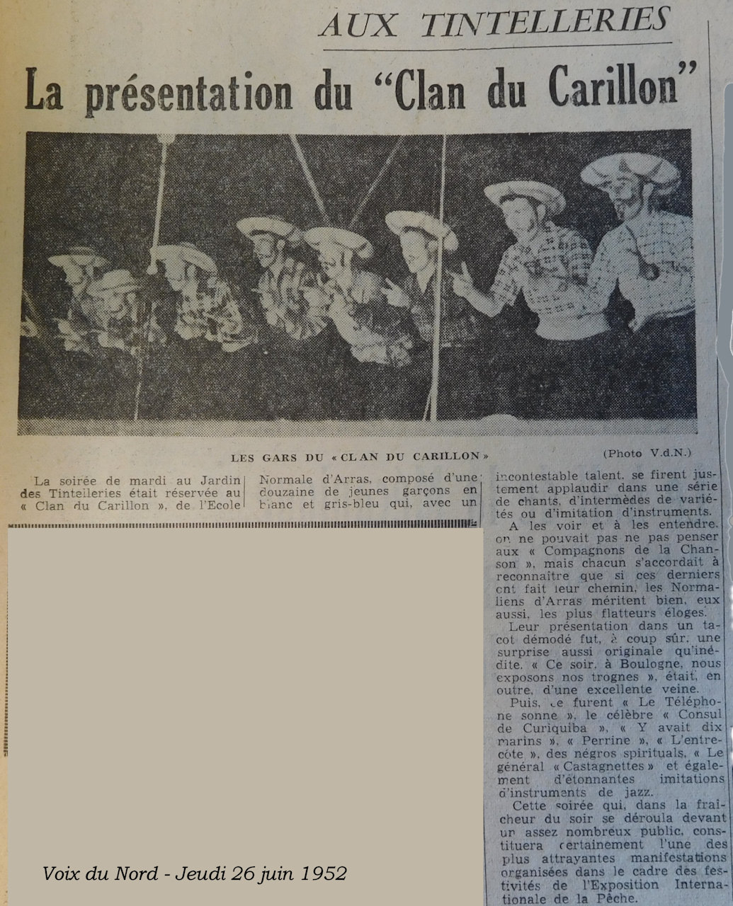 "J'ai trouvé cette rareté, au hasard de mes recherches, dans l'édition de la "Voix du Nord" du jeudi 26 juin 1952. Leur prestation s'inscrivait à l'époque dans le cadre des festivités de "l'Exposition Internationale de la Pêche" à Boulogne-sur Mer en juin 1952... Je pense qu'elle pourrait intéresser un grand nombre d'entre nous, en particulier nos historiens, au cas où ils ne l'auraient pas déjà en leur possession."