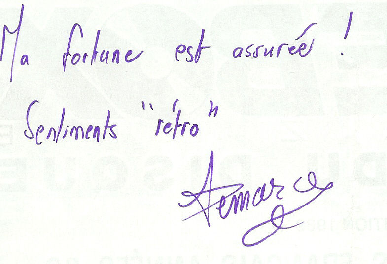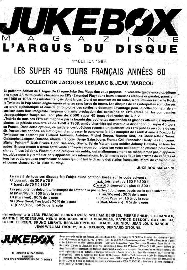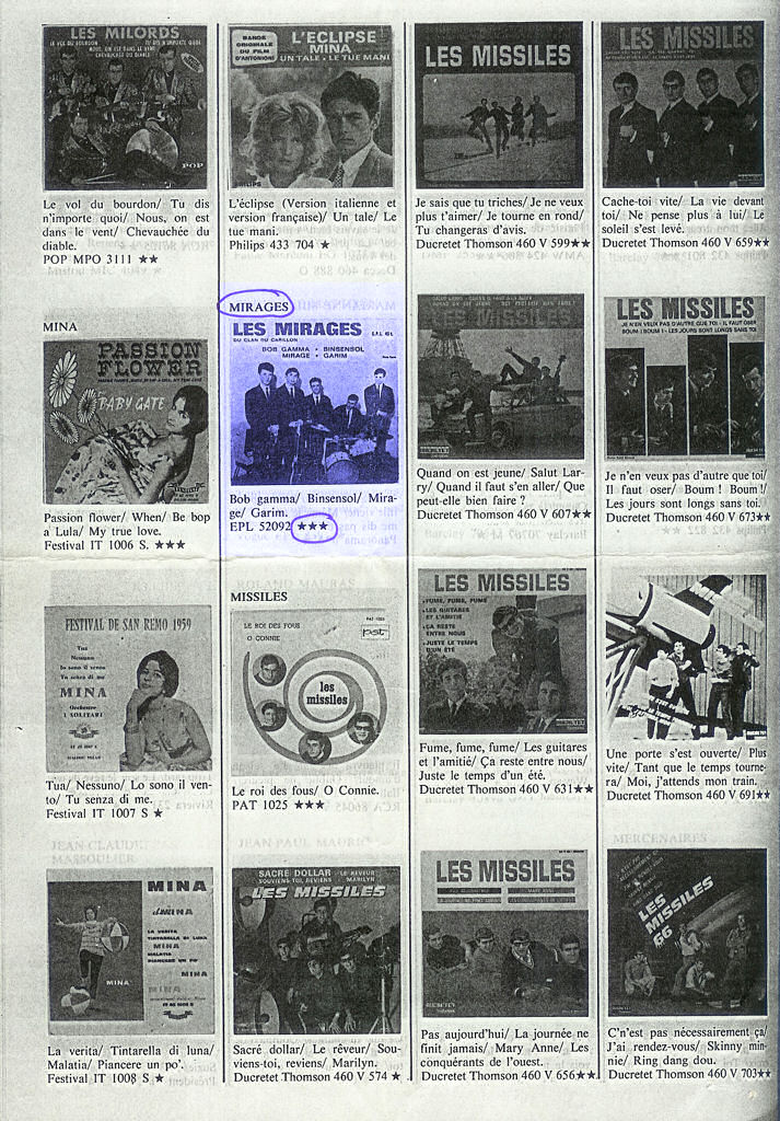 "En fouillant dans mes vieilles caisses ( et sans contrepèterie , stp ) , j'ai retrouvé ce document que m'avait envoyé notre camarade DEMARCQ en 1989, alors que j'étais encore dans le Nord . Le disque des Mirages , tu le constates , y est évalué à plus de 300 F . De 1989 ! Combien en 2007 ? Va savoir ! ... Tous ceux qui ont investi en 1963 n'ont rien à regretter . Financièrement , s'entend ."