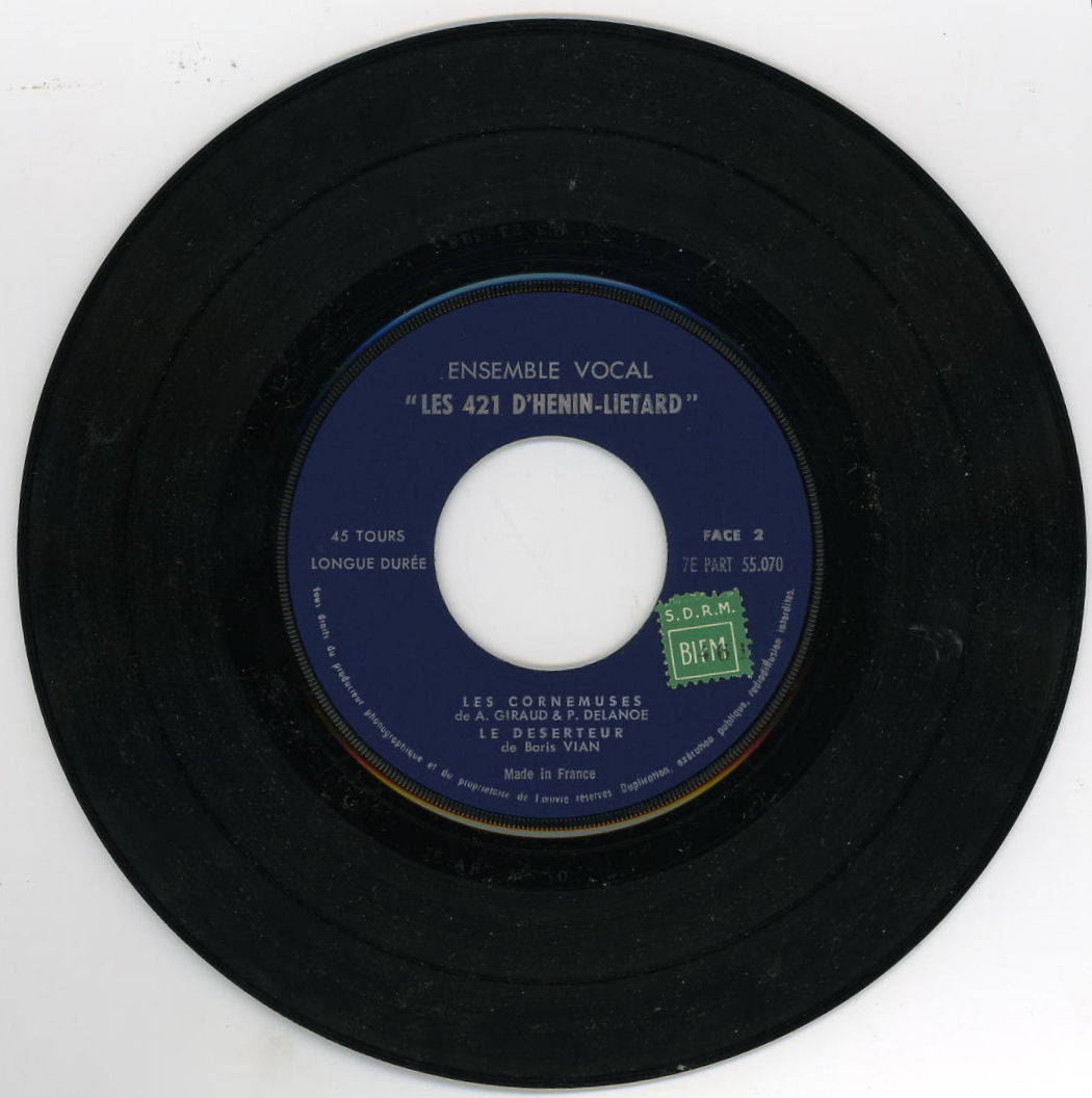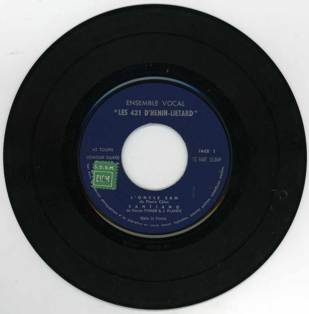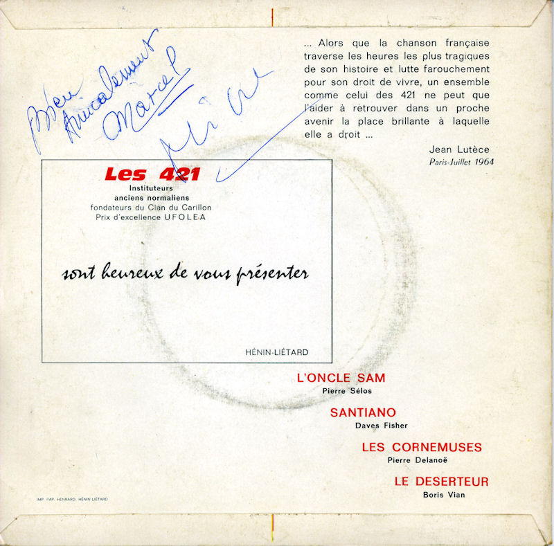 "Les 421". Constitué en 1953 à partir du groupe du "Trèfle à 5 feuilles" auquel sont venus se joindre Emile DUCAMP, Henri BOESCH et Michel GODEFROID, puis, 10 ans plus tard, Roger FARDEL et Marcel PINTE. Trente ans plus tard, les "421" organisent leur dernier concert, à l'École Normale, le 24 mai 1983, pour le centenaire de l'Ecole Normale d'Instituteurs d'Arras. Une belle histoire d'amitié et de franche camaraderie. Les "421" ont enregistré 8 disques (dont les bénéfices étaient reversés à des coopératives scolaires.)