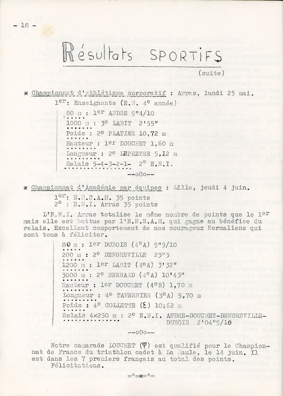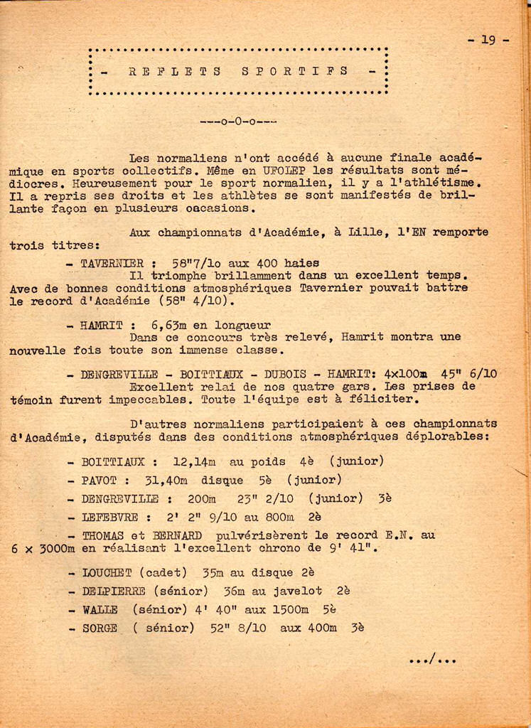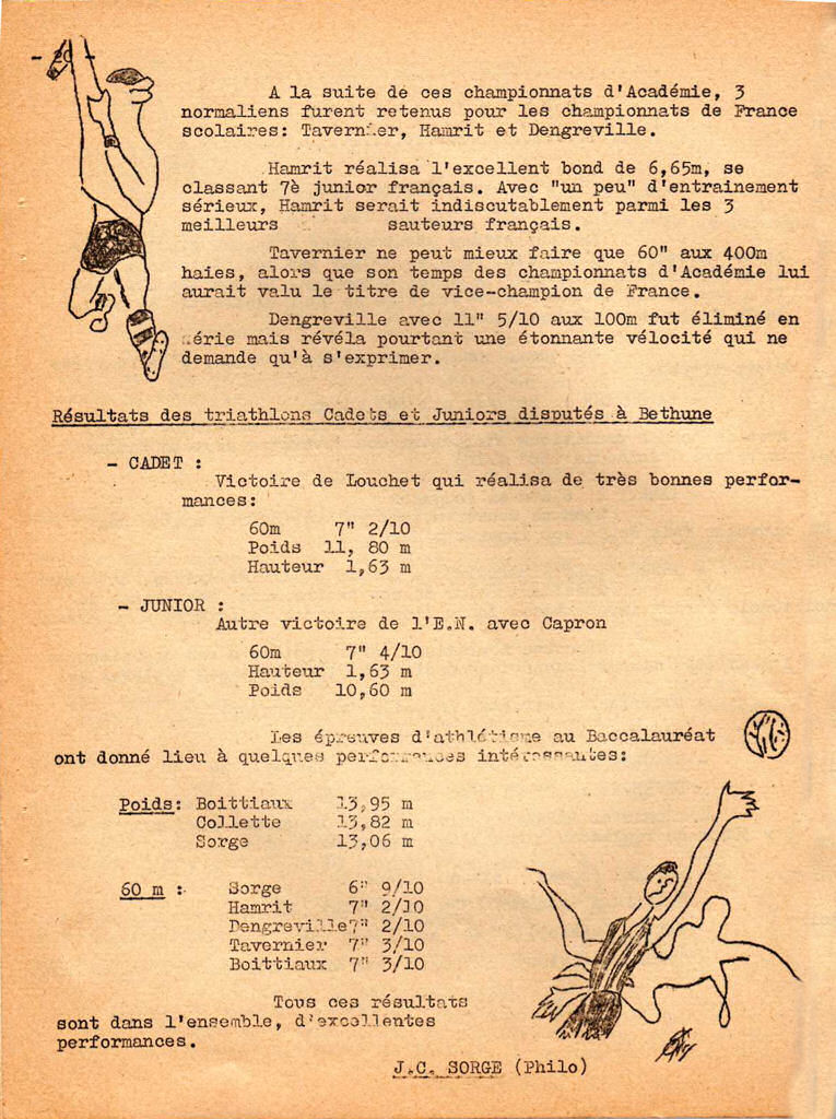 A la suite de ces championnats d'Académie, 3 normaliens furent retenus pour les championnats de France scolaires: TAVERNIER, HAMRIT et DENGREVILLE.