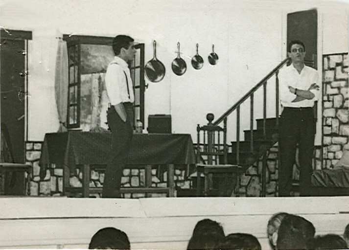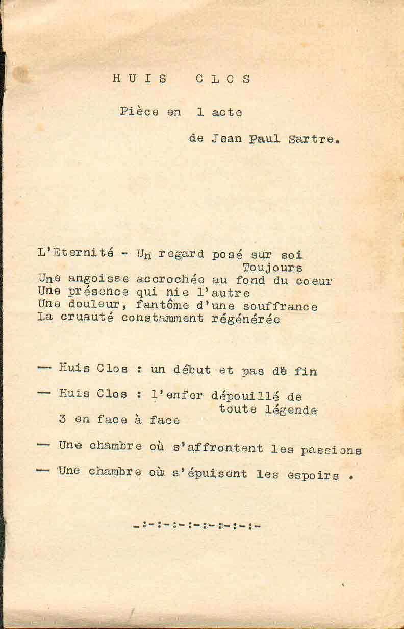 "HUIS CLOS ! Je ne me souviens pas de la date de la représentation, mais elle a eu lieu dans la salle de sports de l' E.N.G. J'avais fait les décors de la pièce et participé à un récital poétique qui avait été donné, je crois, en première partie."