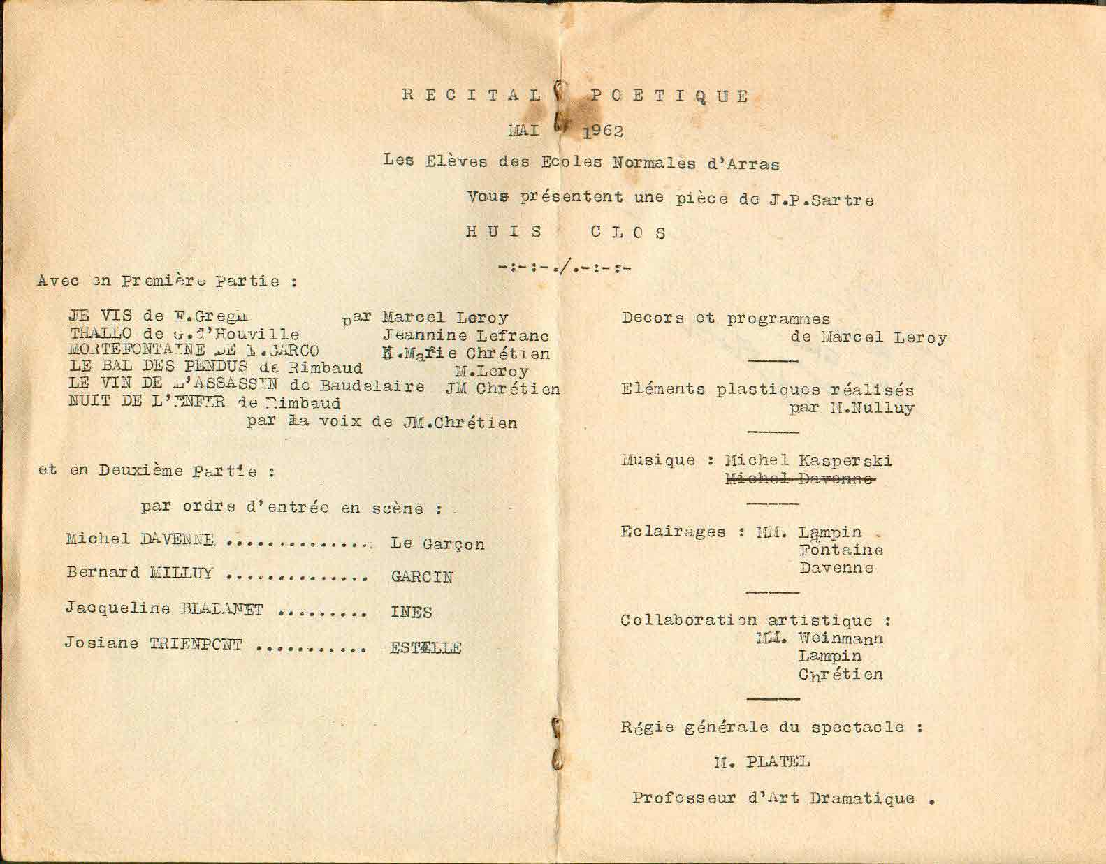 "J'ai retrouvé le fameux programme de HUIS CLOS: " Jeudi 3 mai 1962! . ... DAVENNE a été barré dans la rubrique musique, parce qu' il s'était engagé mais s'est rendu compte qu' il ne pouvait pas tout faire. Hors, à cette époque, pas de photocopieuse pour tout recommencer. Tout était fait à la "Gestetner", artisanalement, alors pas question de recommencer le programme, d' où le nom barré. J'espère que ce document, un peu taché, mais il fait son âge, répondra à la curiosité des amis qui consulteront le site."