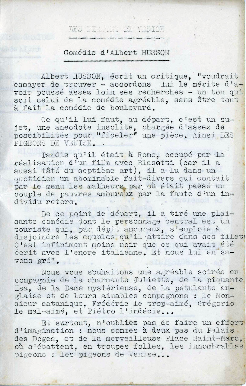 Les élèves de 4ème année présenteront le 14 et 15 décembre (1963) "Les pigeons de Venise", comédie en trois actes de Albert HUSSON.