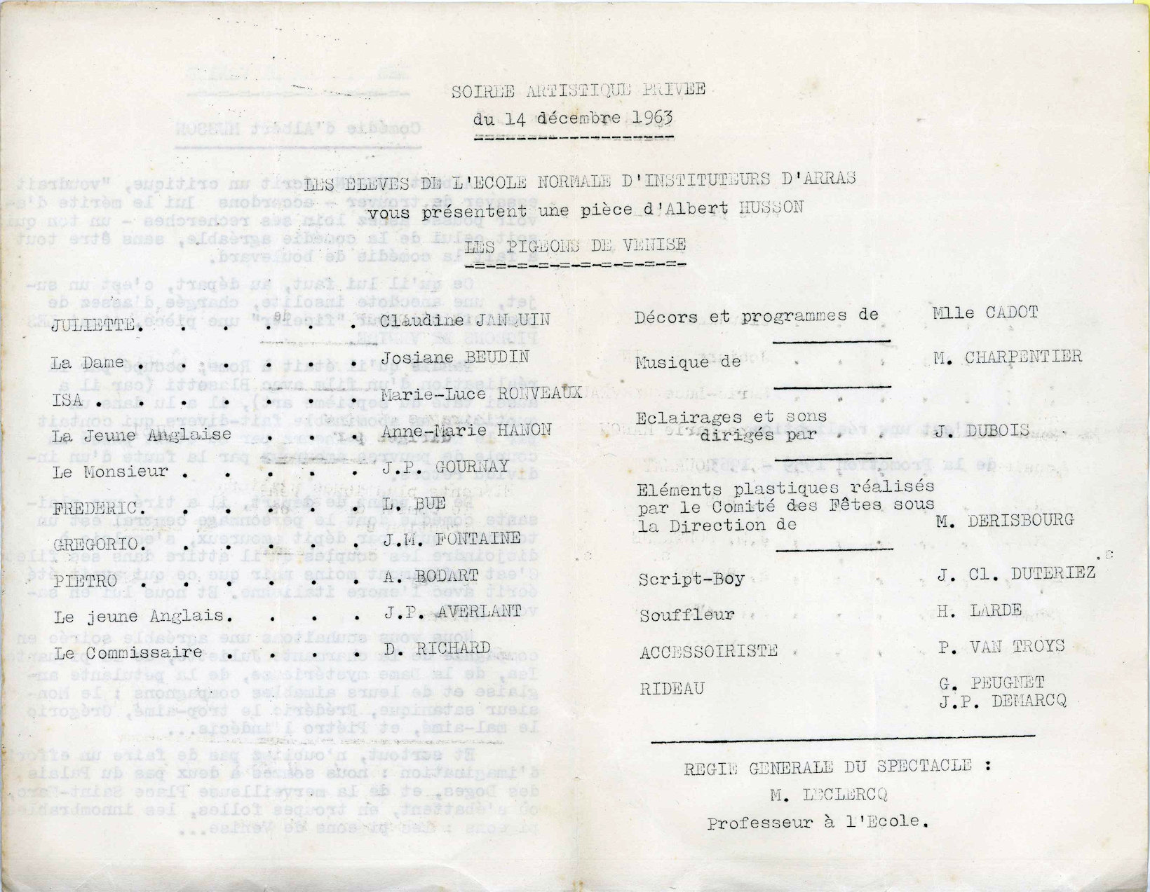 " En décembre 64, Monsieur LEBOEUF a cédé sa place de « metteur en scène » à Monsieur LECLERC, professeur d’allemand, pour produire « Les pigeons de Venise ». "